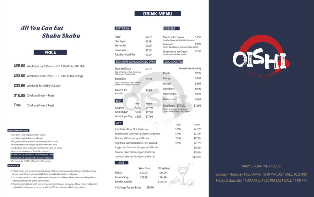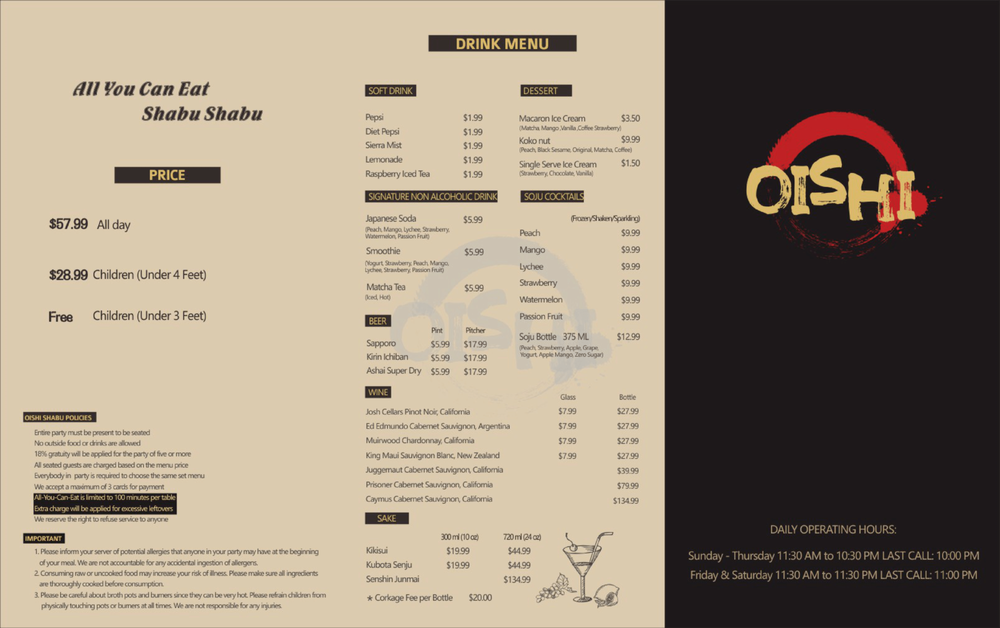 Introducing Oishi Shabu Shabu, a Japanese buffet hotspot in Irvine, CA. This restaurant offers a unique dining experience with options for hot pot enthusiasts and those seeking pescatarian or vegan fare. The menu boasts a variety of fresh ingredients, from premium meats like wagyu to a self-serve seafood bar and an array of vegetables and noodles. Customers rave about the flavorful broths, including tonkatsu and spicy miso, as well as the attentive service and clean atmosphere. The restaurant's innovation shines through with robot servers and individual cooking pots for a personalized experience. With reasonable prices and a diverse selection of dishes, Oishi Shabu Shabu is a must-visit for those looking for a fun and delicious dining experience.